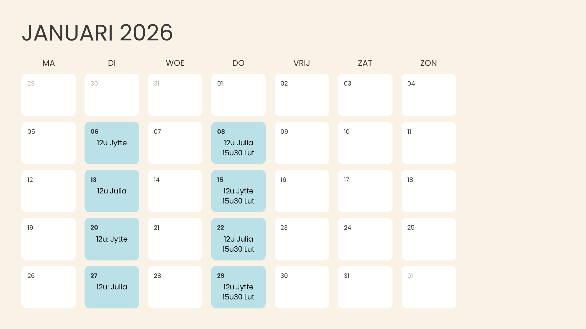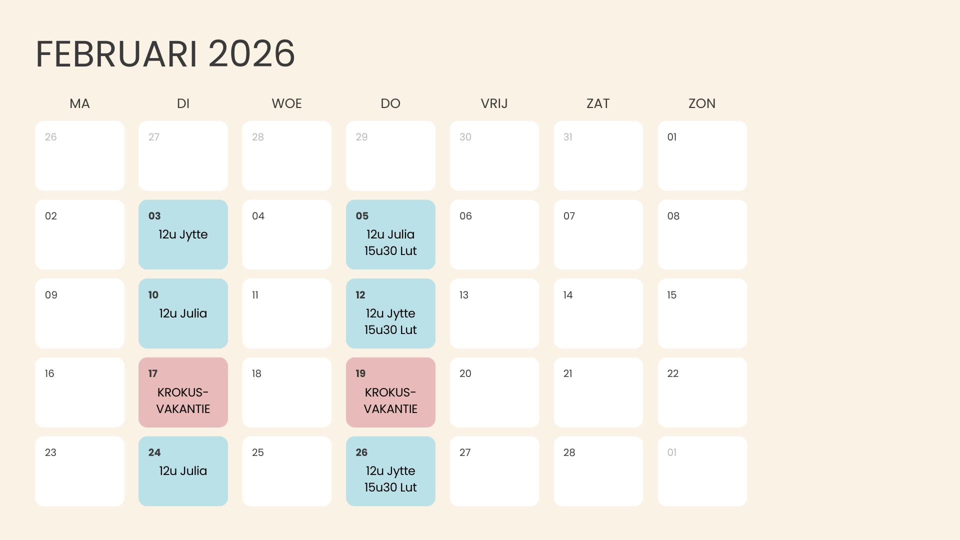 Geen les tijdens schoolvakanties. Deze worden tijdens de vakantieperiodes occasioneel vervangen door alternatieve bewegings- en/of samenkomstmomenten.
